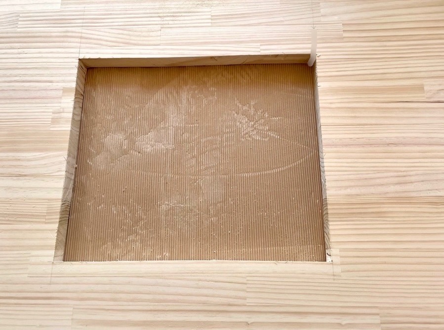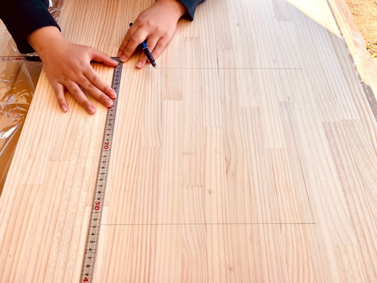まずは天板に収納蓋のくり抜き部分の線を下書きしました。この線がズレると全部の工程がズレてしまうので、