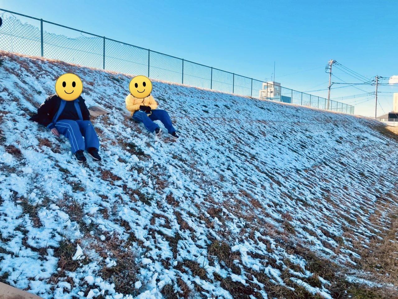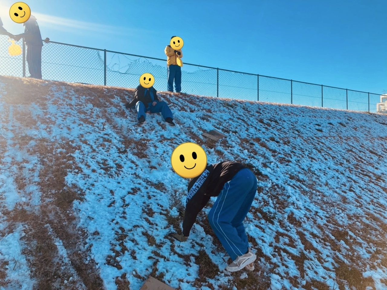 いつものグラウンドのところも雪が残っていて持ってきたソリで滑っていました。