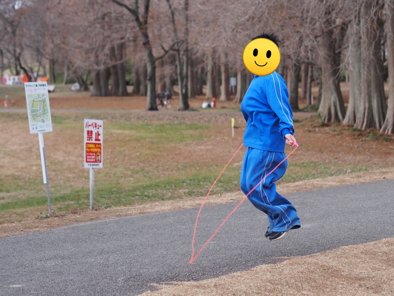 軽く足を伸ばしたり体操をした後は縄跳びをします。