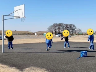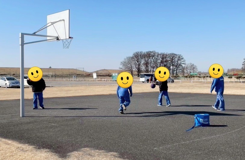 青空の下でみんなでバスケットボールをしました。